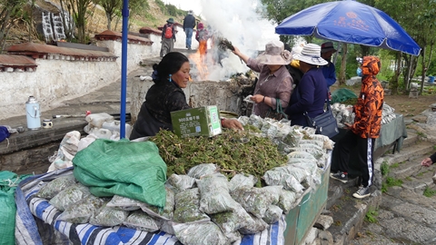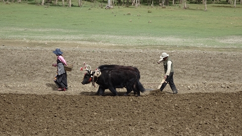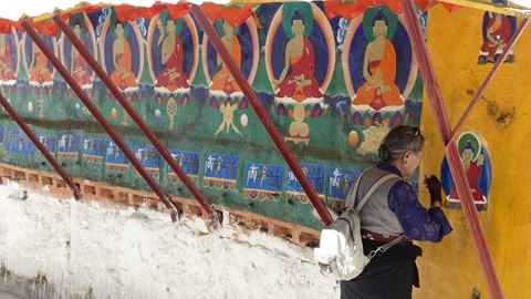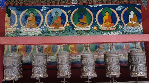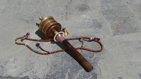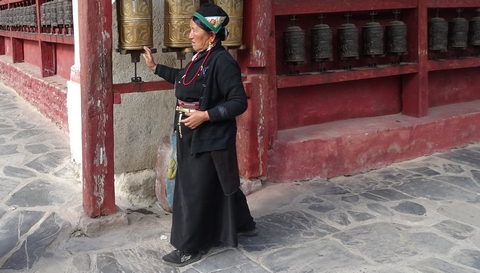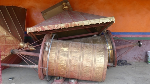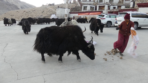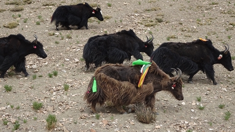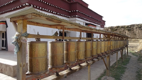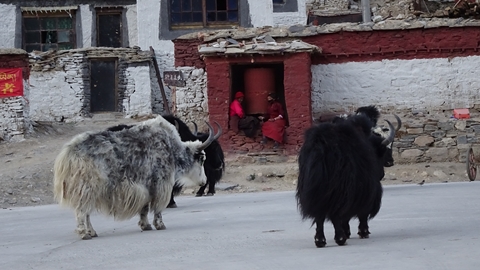 ralliement aux yaks, des moulins à prière sont actionnés par une petite