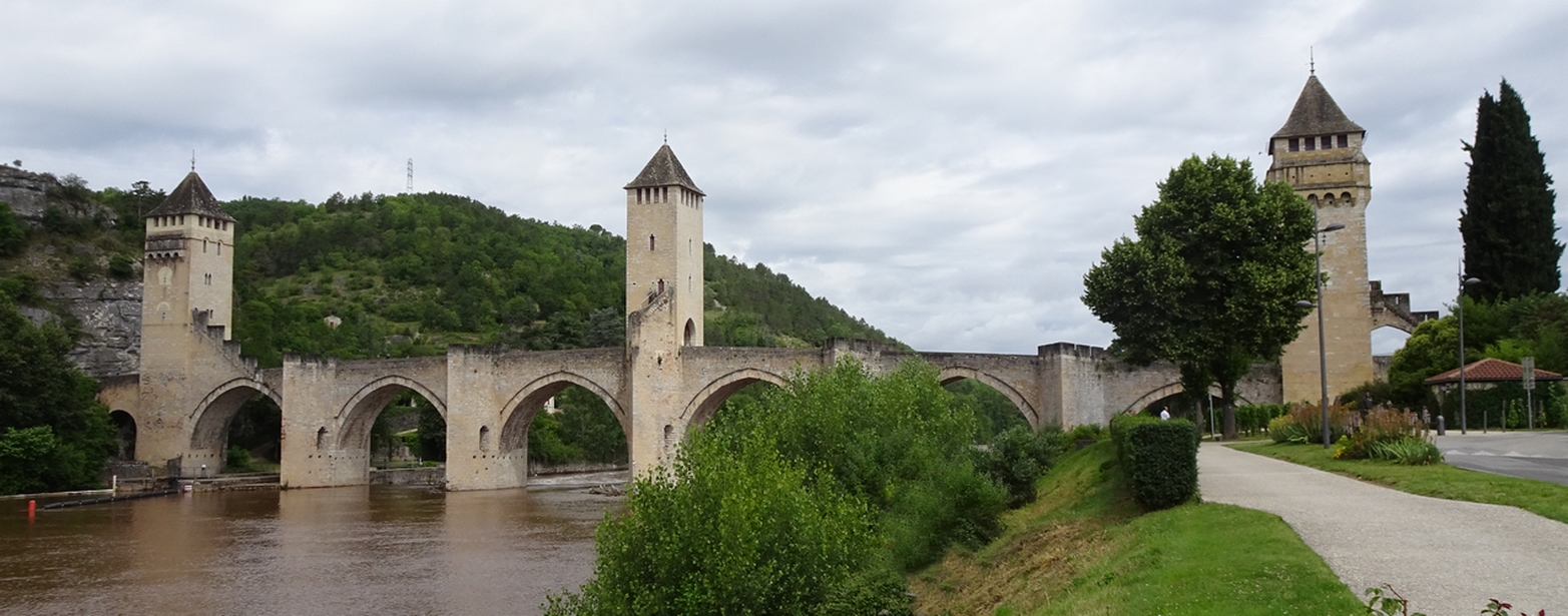 franchissant le Lot à l'ouest deCahors. Ses trois tours fortifiées en