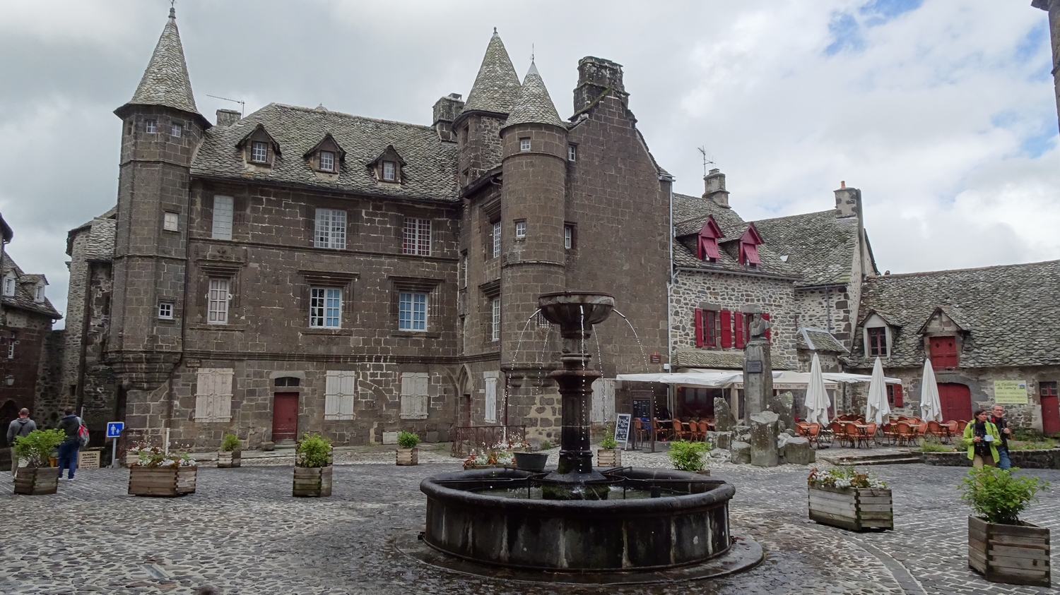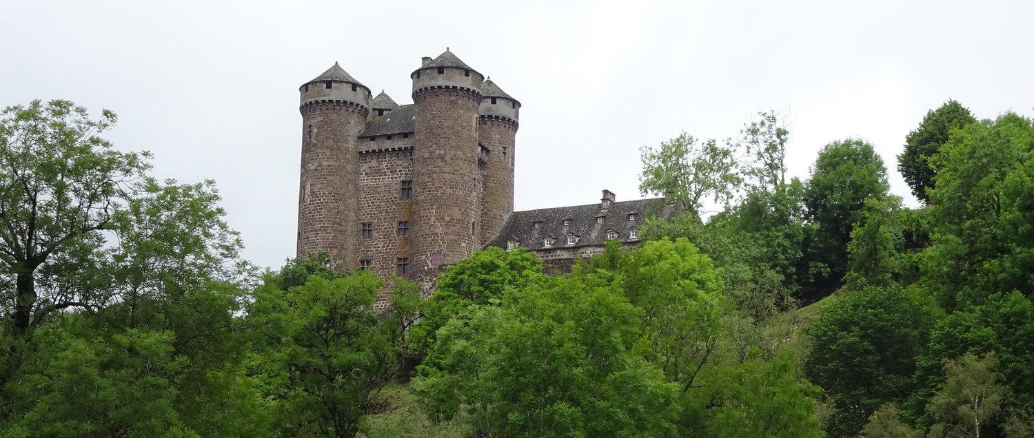 Il s'est constitué autour d'un château situé sur une butte basaltique et surplombe la vallée de la Maronne.