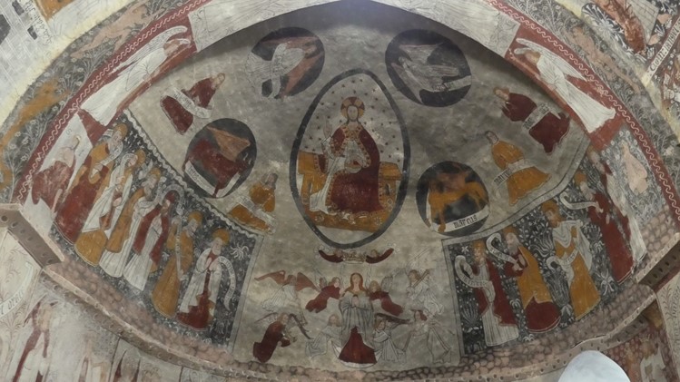 La voûte et les murs sont entièrement recouverts de peintures murales, classées.