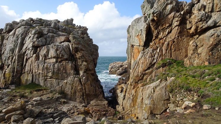 le gouffre de Plougrescant, surnommé gouffre de la Baie d’Enfer, la mer déferle dans une profonde entaille entre des pans de falaises.