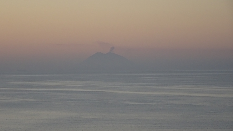 depuis le bord de mer est rude. On aperçoit au loin le volcan Stromboli.