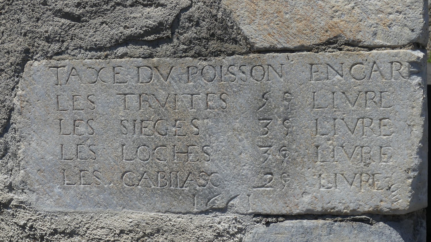 A la porte Cabirole une inscription fait état de la taxe du poisson en Carême. Elle date de 1661.