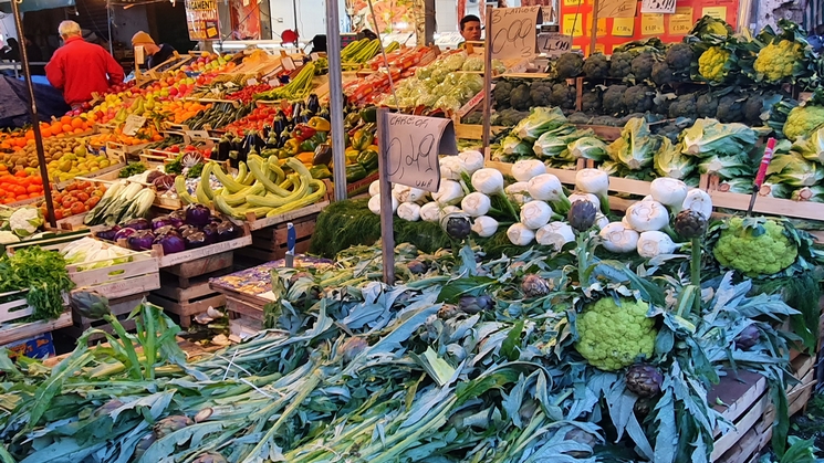 beaucoup de rues et les beaux fruits et légumes proposés au marché.