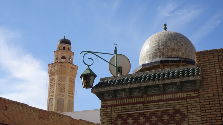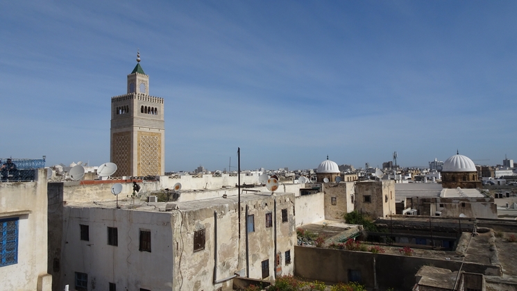 mosquée Zitouna et la ville.La mosquée arabe a un minaret carré et la
